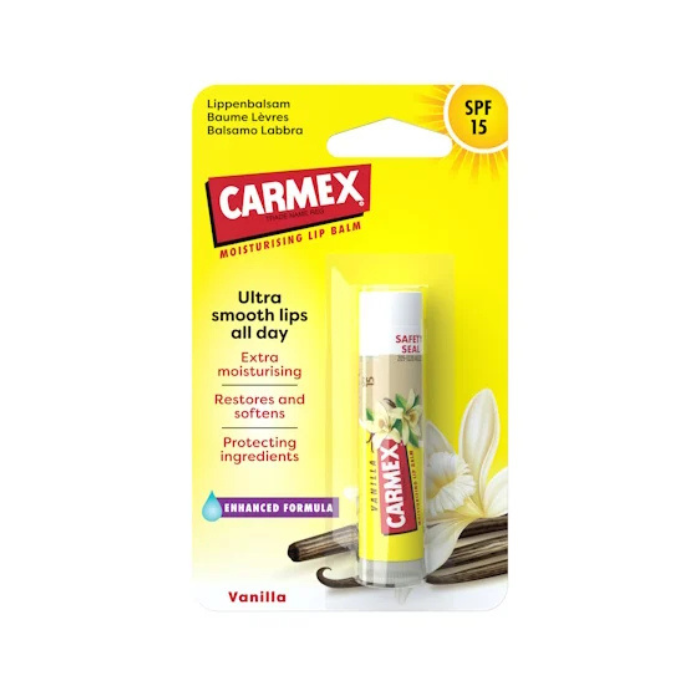 No more dry and chapped lips! Carmex Vanilla SPF stick lip balm features an extra moisturising formula to protect your lips from harmful external factors and prevent them from cracking. The balm has an SPF of 15, offering protection against sunlight – plus it smells divine!