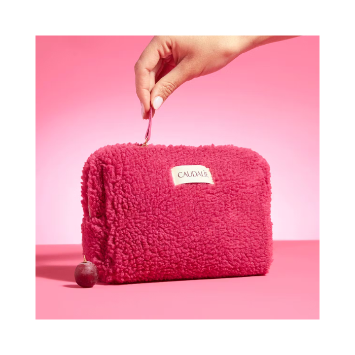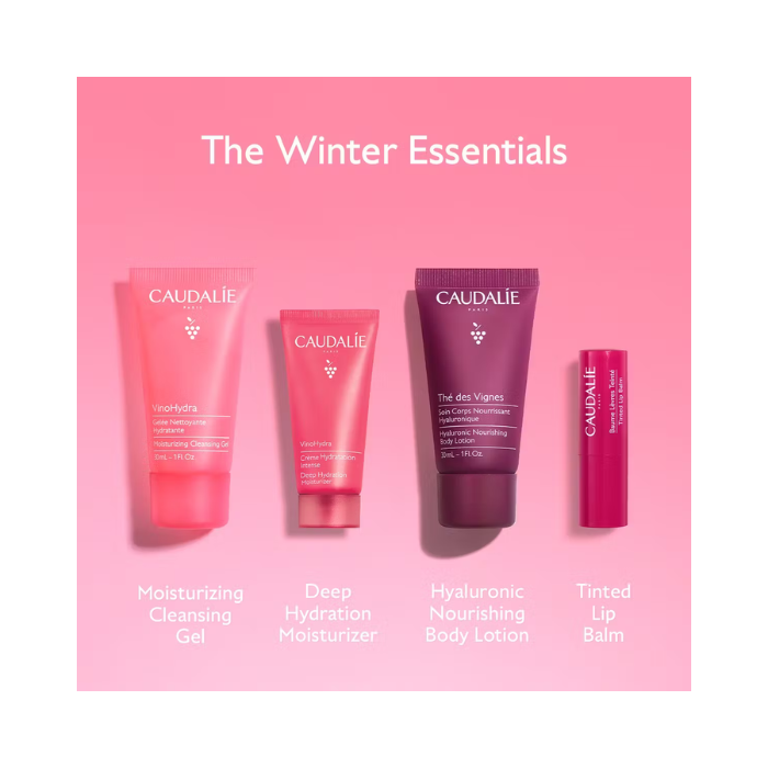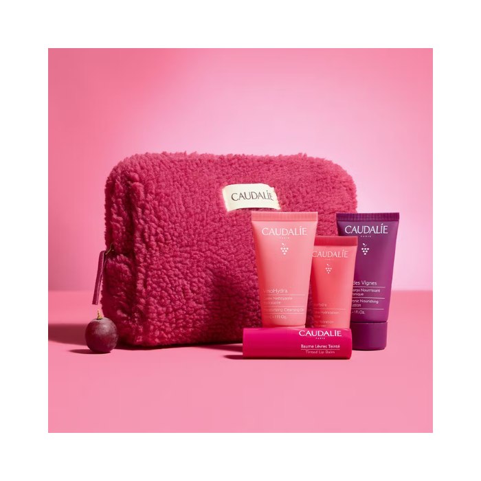 This limited edition bag has 4 travel-size hydrating Face and Body products: a Moisturizing Cleansing Gel 30ml, a Deep Hydration Moisturizer 15ml, a Tinted Lip Balm 4.5G and a Thé des Vignes Hyaluronic Nourishing Body Lotion 30ml.
