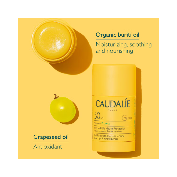 Vinosun Protect Invisible High Protection Stick SPF50 protects the face, lips and sensitive areas (moles, scars, tattoos) from UVA/UVB rays in a single invisible application. Enriched with organic grapeseed and buriti oil, its formula is nourrishing but non-greasy. Fragrance-free and water-resistant, it is suitable for both adults and children aged 3 and over.