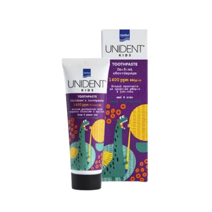 Unident kids toothpaste is a specially designed fluoride toothpaste for the daily protection and strengthening of sensitive baby teeth. With fluorine from organic molecules, for better absorption than equivalent inorganic compounds, it offers effective and long-lasting protection against caries. Xylitol, a natural sweetener, protects daily teeth from decaying acids and prevents the formation of the microbial plaque.
