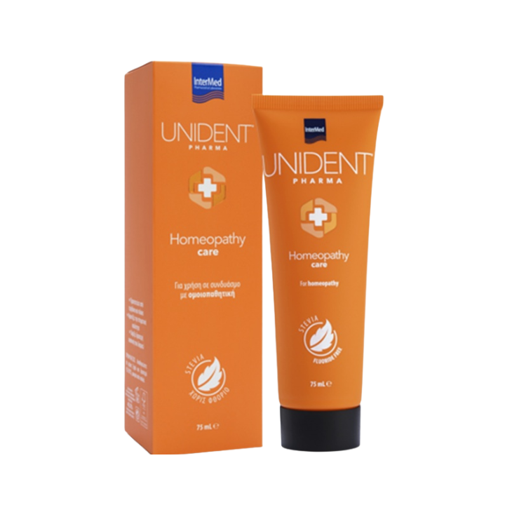 Unident Pharma Homeopathy Care is a daily toothpaste without fluoride, for use in combination with homeopathic treatments. The absence of menthol and flavors in this toothpaste formulation aligns with the principles of homeopathy, which emphasize the use of minimal, natural ingredients.
